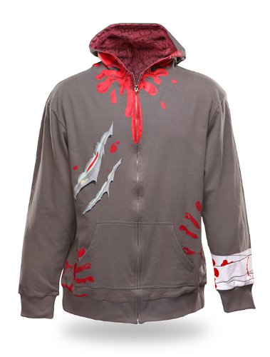 Trendex , For defending oneself during the upcoming zombie apocalypse, we highly recommend a hoodie. Layering is key. One minute you're going to be running, next minute you're going to be hiding in a cold, dark corner. It pays to have layers. This hoodie features the battle scars you earned in your fight with the zombie hordes. Clearly, you've had better days. There are bloody handprints near the pockets and slashes across the chest. There's a deep slash across the back that reveals your exposed spine. There's a bandage on your left wrist revealing bite marks. There's a chunk of missing skull on the back of the hood, which is lined in brains. We'd say you ought to get that looked at, except there's a pretty massive blood spatter on the front of the hood around the area where your mouth would be. Which implies that you ain't one of us any more. But you put up a valiant fight, and for that we salute you. But we're not taking the helmet off, no how, no way.