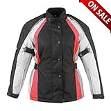 Jafrum , Women's Waterproof Motorcycle Jacket with Armor LJ3002 Red. Women's Textile Motorcycle Jacket with waterproof lining, zip-out insulation lining, air vents, CE Armor etc. Item: LJ3002Red Color: Red Jacket Features: Made of Duratex 600D Fixed Seam Sealed Waterproof lining Full Sleeve Zip-out quilted lining with insulation material Night Vision Reflective Material Adjustable collar and sleeve straps Air Vents on Front and Back Removable soft protectors - shoulder, elbow and back LJ3002 Jacket Size Chart: Please use a cloth tape measure to measure the circumference of your chest/bust in inches. Add one inch if the measurement is an odd number and choose the size from the chart below. XS - 34 inches chest/bust S - 36 inches chest/bust M - 38 inches chest/bust L - 40 inches chest/bust XL - 42 inches chest/bust 2XL - 44 inches chest/bust 3XL - 46 inches chest/bust 4XL - 48 inches chest/bust 5XL - 50 inches chest/bust 6XL - 52 inches chest/bust ...